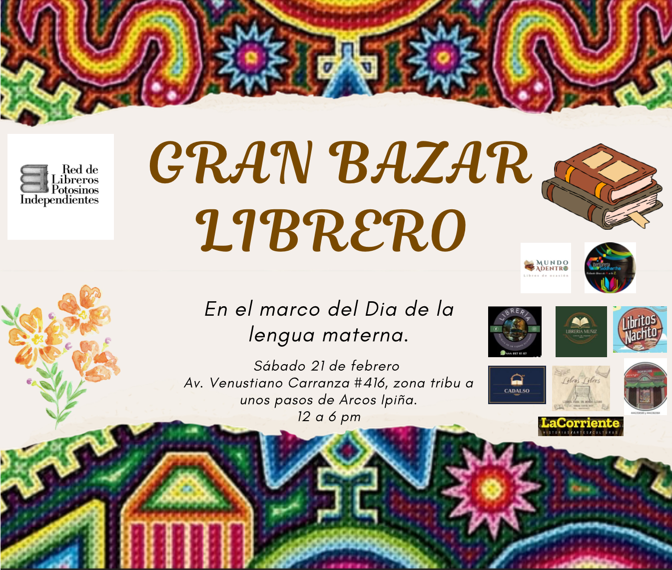 Bazar del Libro, el Sábado 21 de febrero de 12:00–18:00 h en Av. Venustiano Carranza #416, Centro Histórico, SLP, entre Bolivar e Independencia, a unos pasos de Arcos Ipiña.